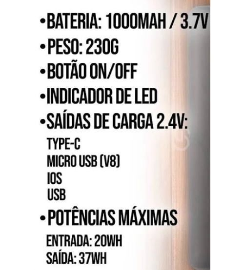 Conexões de entrada Micro USB- Potência máxima de saída: 37Wh;